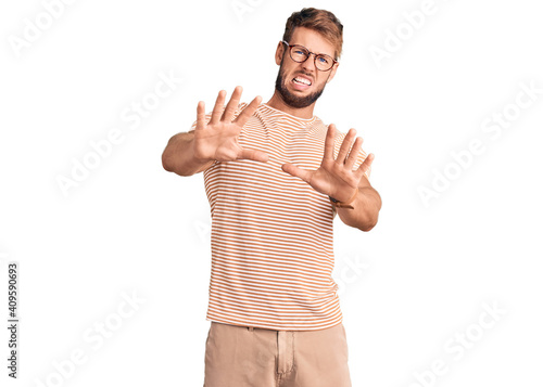 Young caucasian man wearing casual clothes and glasses afraid and terrified with fear expression stop gesture with hands, shouting in shock. panic concept.