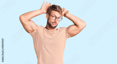 Young caucasian man wearing casual clothes and glasses doing bunny ears gesture with hands palms looking cynical and skeptical. easter rabbit concept.