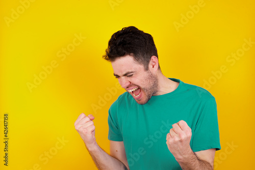 young Caucasian man wearing green T-shirt against yellow wall very happy and excited doing winner gesture with arms raised, smiling and screaming for success. Celebration concept.