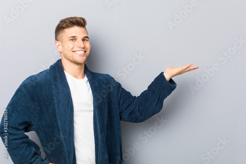 Young caucasian man wearing pajama showing a copy space on a palm and holding another hand on waist.