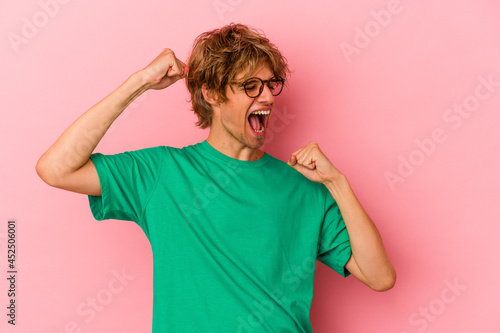 Young caucasian man with make up isolated on pink background raising fist after a victory, winner concept.