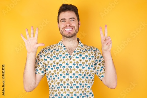 Young caucasian man with short hair wearing red shirt standing over isolated yellow background showing and pointing up with fingers number seven while smiling confident and happy.