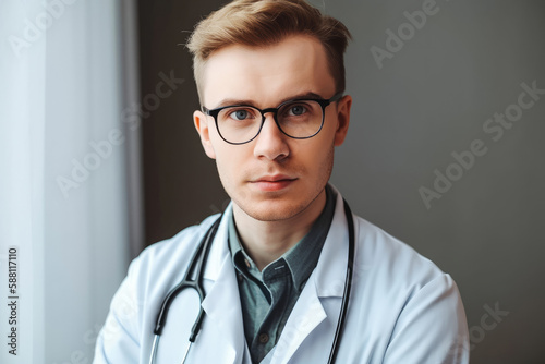 Young caucasian medical doctor in lab coat, wearing glasses. Generative AI.