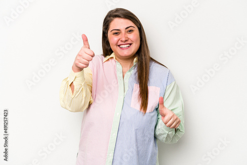 Young caucasian overweight woman isolated on white background raising both thumbs up, smiling and confident.