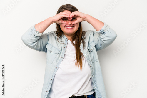 Young caucasian overweight woman isolated on white background showing okay sign over eyes