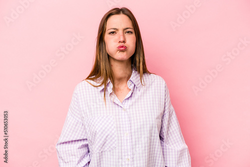 Young caucasian pregnant woman isolated on white background blows cheeks, has tired expression. Facial expression concept.
