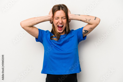 Young caucasian pregnant woman isolated on white background covering ears with hands trying not to hear too loud sound.
