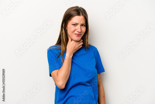Young caucasian pregnant woman isolated on white background suffers pain in throat due a virus or infection.