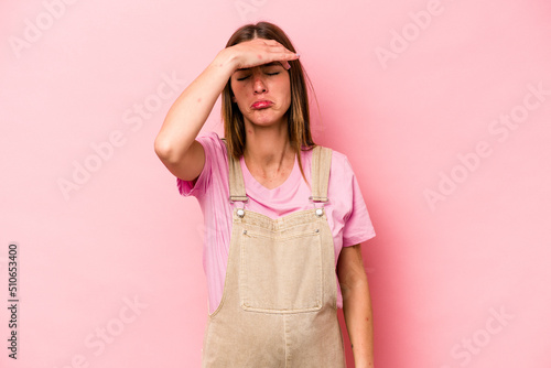 Young caucasian pregnant woman isolated on white background touching temples and having headache.