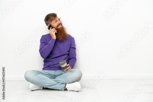 Young caucasian reddish man sitting on the floor isolated on white background holding coffee to take away and a mobile
