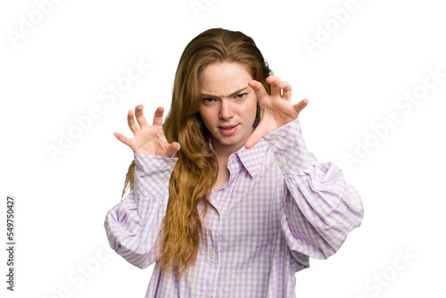 Young caucasian redhead woman isolated showing claws imitating a cat, aggressive gesture.