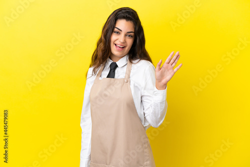 Young caucasian restaurant waiter isolated on yellow background saluting with hand with happy expression