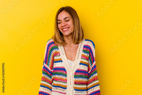 Young caucasian skinny woman isolated on yellow background confident keeping hands on hips.