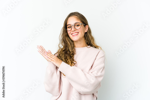 Young caucasian woman feeling energetic and comfortable, rubbing hands confident.