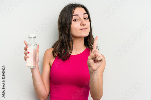 Young caucasian woman holding a bottle of water isolated on white background showing number one with finger.