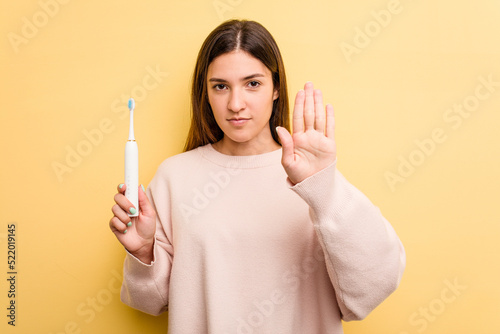 Young caucasian woman holding a electric toothbrush isolated on yellow background standing with outstretched hand showing stop sign, preventing you.