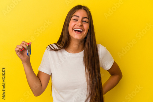 Young caucasian woman holding a home keys isolated on yellow background laughing and having fun.