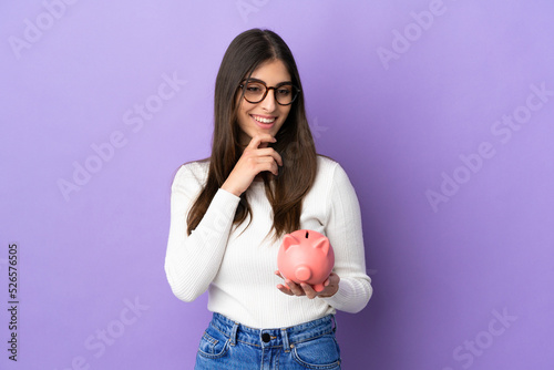 Young caucasian woman holding a piggybank isolated on purple background looking to the side and smiling