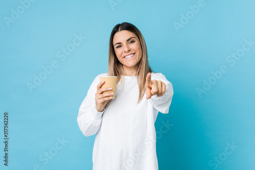 Young caucasian woman holding a takeaway coffee cheerful smiles pointing to front.