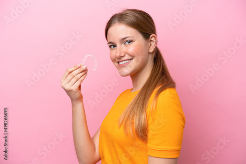 Young caucasian woman holding invisaging isolated on pink background smiling a lot