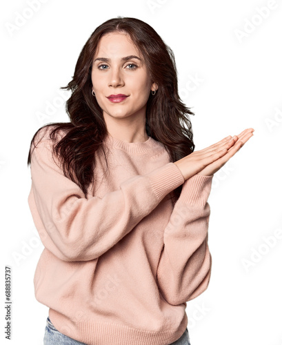 Young Caucasian woman in a studio setting feeling energetic and comfortable, rubbing hands confident.