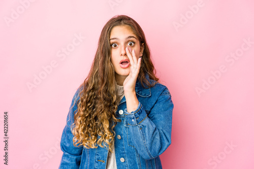 Young caucasian woman is saying a secret hot braking news and looking aside