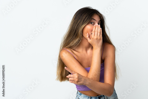 Young caucasian woman isolated on white background pointing to the side to present a product and whispering something
