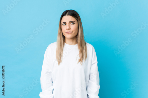 Young caucasian woman isolated confused, feels doubtful and unsure.