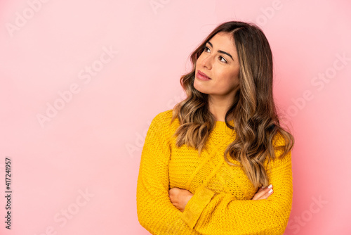 Young caucasian woman isolated dreaming of achieving goals and purposes