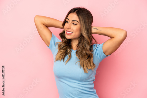 Young caucasian woman isolated feeling confident, with hands behind the head.
