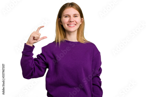 Young caucasian woman isolated holding something little with forefingers, smiling and confident.