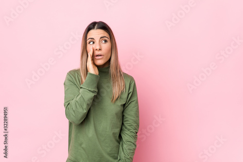 Young caucasian woman isolated is saying a secret hot braking news and looking aside