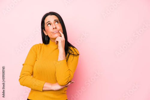 Young caucasian woman isolated on a pink background looking sideways with doubtful and skeptical expression.