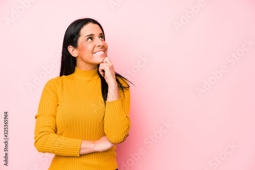 Young caucasian woman isolated on a pink background looking sideways with doubtful and skeptical expression.