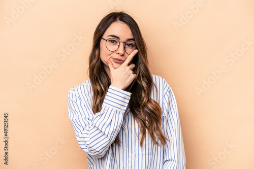 Young caucasian woman isolated on beige background contemplating, planning a strategy, thinking about the way of a business.