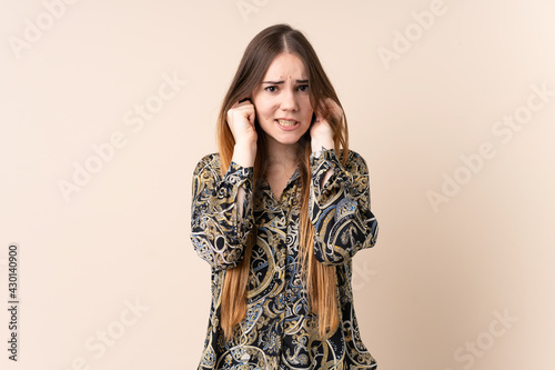 Young caucasian woman isolated on beige background frustrated and covering ears