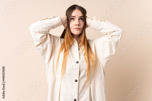 Young caucasian woman isolated on beige background frustrated and covering ears