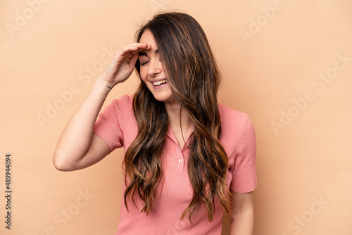 Young caucasian woman isolated on beige background joyful laughing a lot. Happiness concept.
