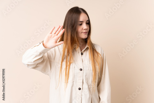Young caucasian woman isolated on beige background making stop gesture and disappointed