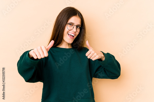 Young caucasian woman isolated on beige background raising both thumbs up, smiling and confident.