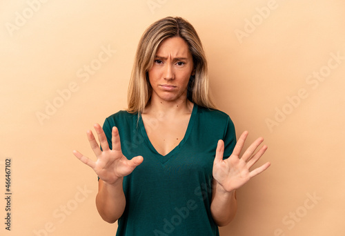 Young caucasian woman isolated on beige background rejecting someone showing a gesture of disgust.