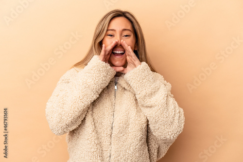 Young caucasian woman isolated on beige background saying a gossip, pointing to side reporting something.