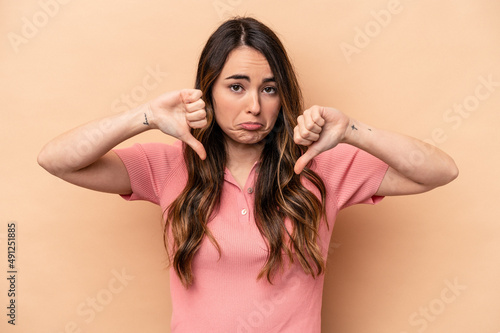 Young caucasian woman isolated on beige background showing a dislike gesture, thumbs down. Disagreement concept.