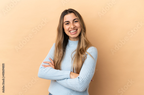 Young caucasian woman isolated on beige background with arms crossed and looking forward