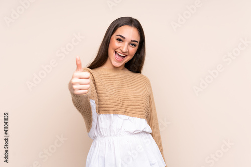Young caucasian woman isolated on beige background with thumbs up because something good has happened