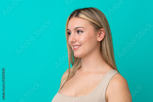 Young caucasian woman isolated on blue background . Portrait