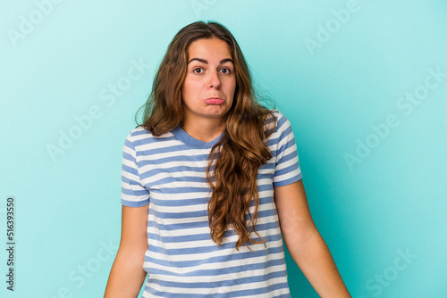 Young caucasian woman isolated on blue background shrugs shoulders and open eyes confused.