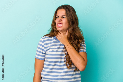 Young caucasian woman isolated on blue background touching back of head, thinking and making a choice.