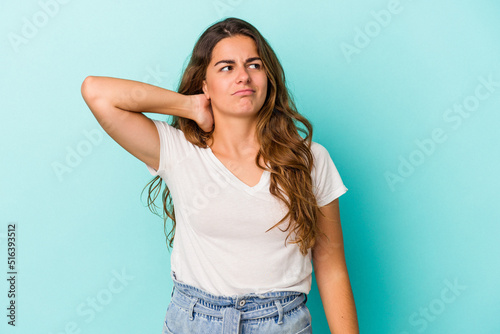 Young caucasian woman isolated on blue background touching back of head, thinking and making a choice.
