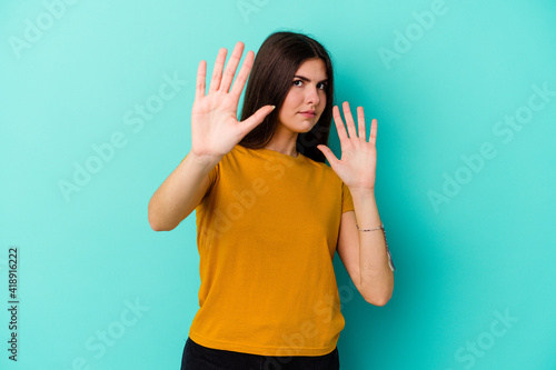 Young caucasian woman isolated on blue background being shocked due to an imminent danger